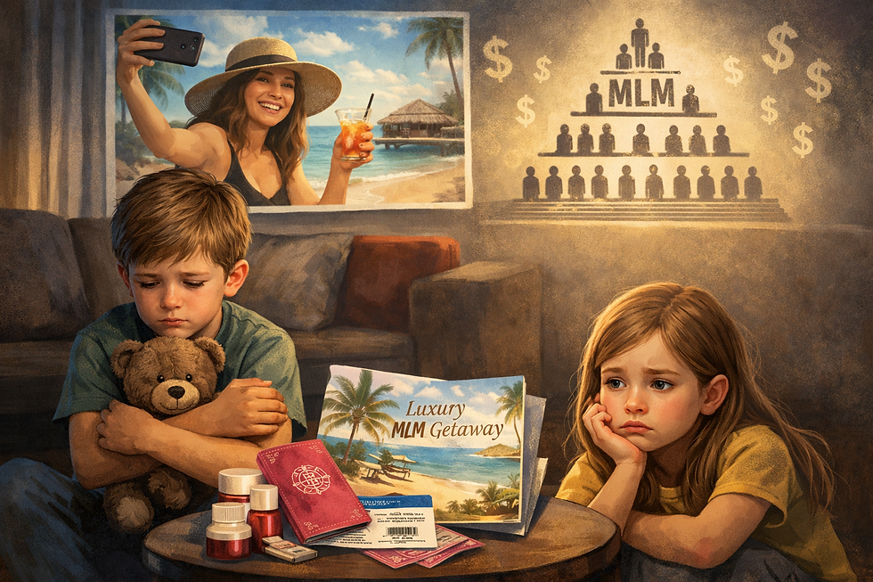 In my professional experience working with children, I have seen how MLM schemes can disrupt family bonds and emotional security. Many children feel rejected and overlooked when their primary caregiver prioritises overseas MLM trips—often marketed as “child-free holidays”—over time at home. While we rightly encourage women and mothers to pursue self-care and meaningful careers, research consistently shows that children’s wellbeing is closely tied to stable, responsive caregiving and a sense of emotional security. When parental absence is frequent and/or accompanied by stress and financial instability, children may experience feelings of uncertainty, rejection, and anxiety. Over time, these pressures can be internalised, shaping their beliefs about money, work, and self-worth in harmful ways (Baker, 2018).